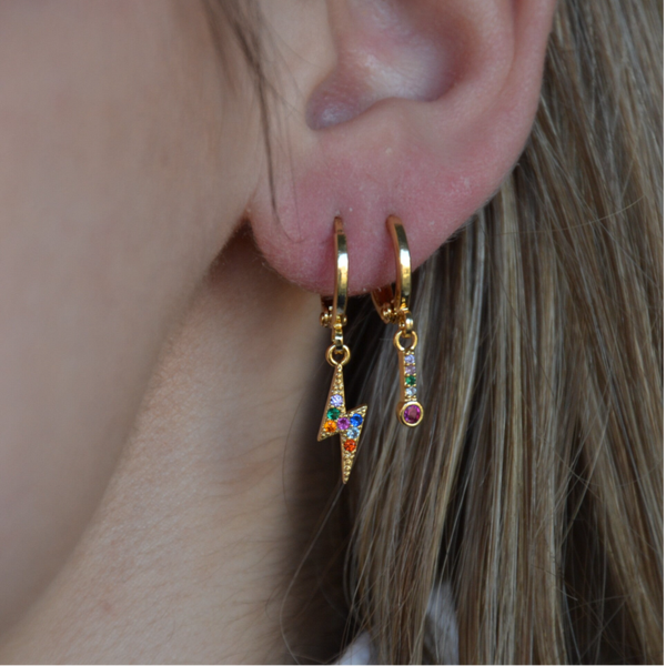 Oorbellen in de vorm van een bliksemschicht met kleurrijke en sprankelende zirconia stenen. Momenteel enkel beschikbaar in het goud.