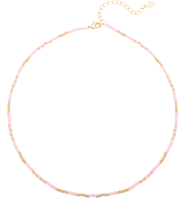 Een korte ketting met kleine roze en gouden kraaltjes. Door zijn zachte kleur en omdat hij zo fijn is, kan deze ketting met veel gecombineerd worden.
